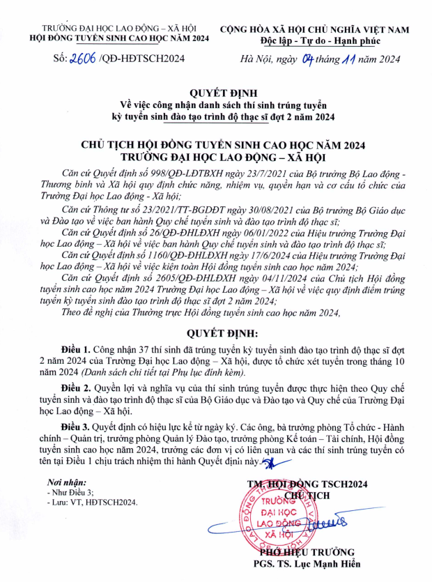 Công nhận danh sách trúng tuyển Thạc sĩ đợt 2 năm 2024