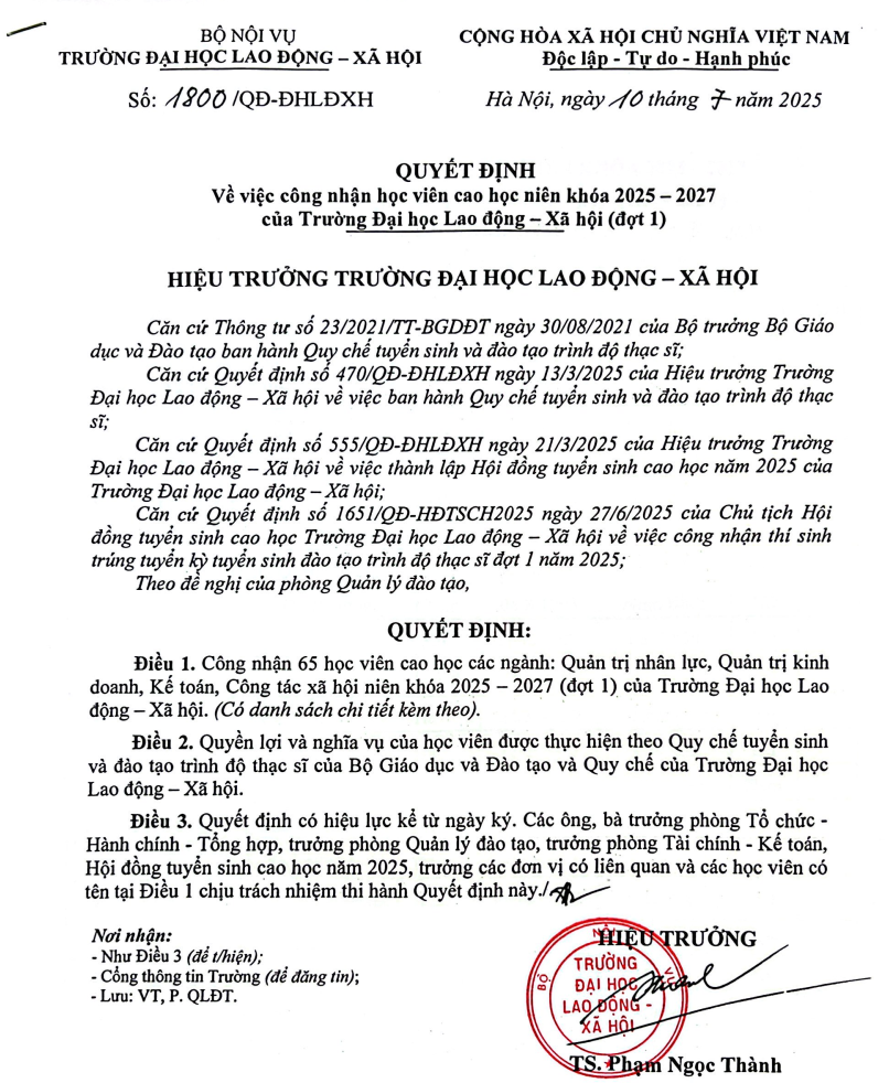 Công nhận học viên cao học niên khóa 2025 - 2027