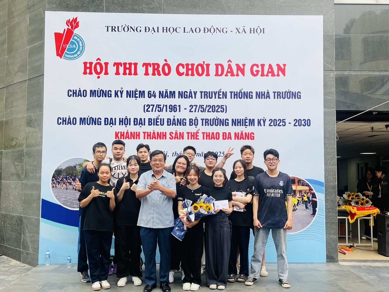 Hướng tới kỷ niệm Ngày Truyền thống Trường Đại học Lao động - Xã hội và Đại hội đại biểu Đảng bộ Trường nhiệm kỳ 2025-2030, sáng ngày 27/5/2025, tại khuôn viên sân nhà A và D, Đảng ủy, Ban Giám hiệu phối hợp cùng các đơn vị trong trường đã tổ chức thành công Hội thi “Trò chơi Dân gian” với sự tham gia nhiệt tình của đông đảo cán bộ, giảng viên, sinh viên các khối. Đây là một trong những hoạt động ý nghĩa nhằm phát huy giá trị văn hóa truyền thống và tăng cường tình đoàn kết trong toàn thể cán bộ, giảng viên và sinh viên Nhà trường.